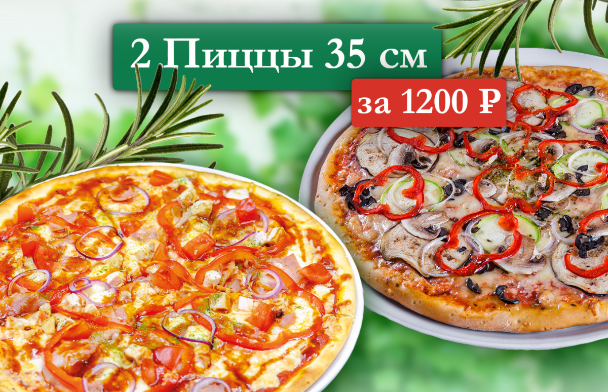 Две пиццы по спеццене 35 см за 1200 рублей. В акции участвуют пиццы 35 см (Барбекю, Кватро Формаджи, Маргарита, Панчетта, Примавера, С цыпленком, Пепперони)