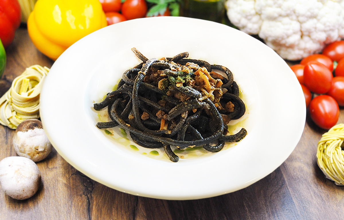 Спагетти с чернилами и соусом болоньезе