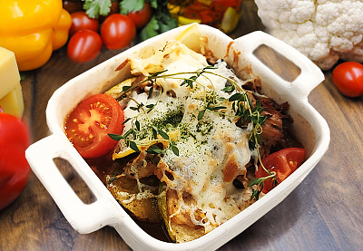 Запечённый цыпленок каччиаторе с лимоном, цукини и картофелем гриль
