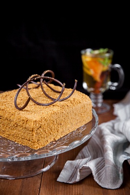 Медовые бисквитные коржи и заварной крем с добавлением варёной сгущёнки и грецких орехов.